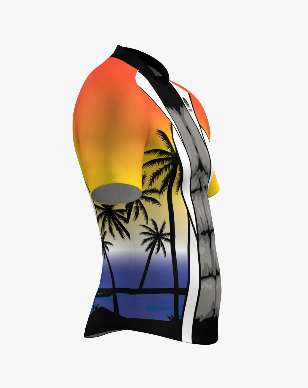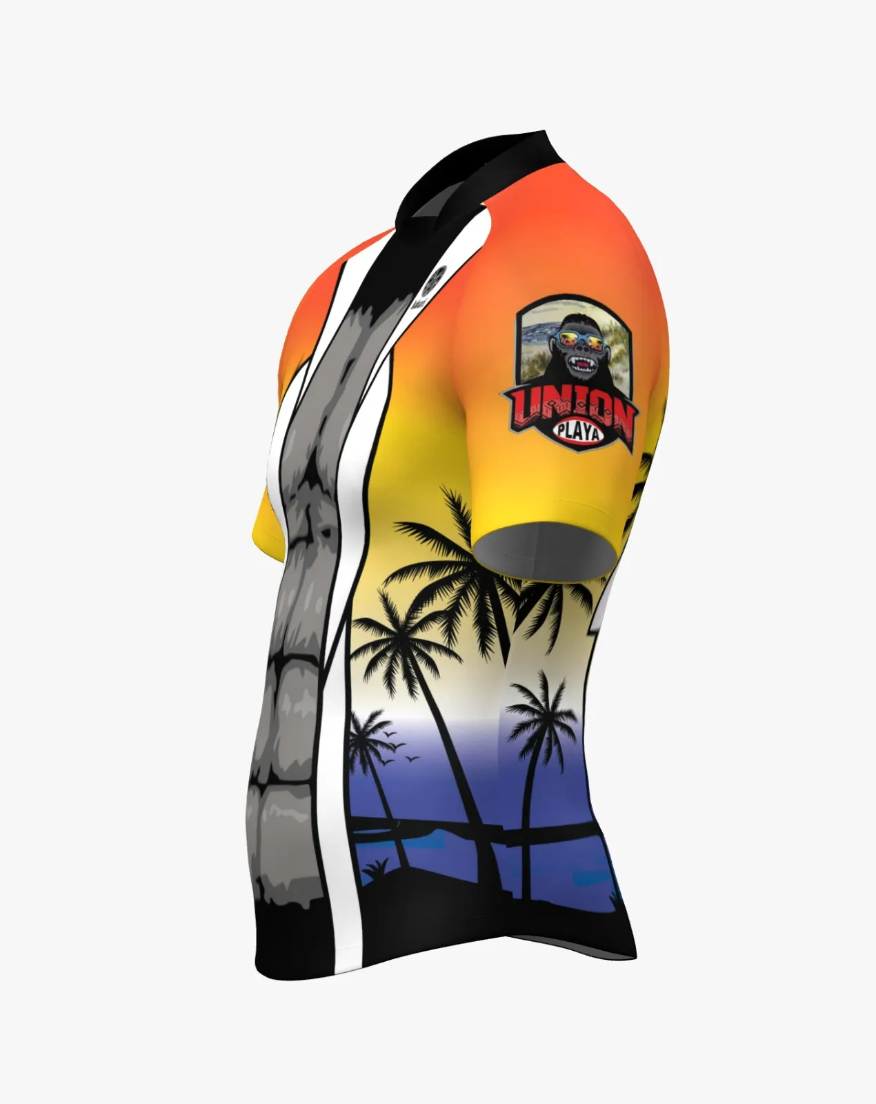 El diseño presenta un degradado inspirado en un atardecer tropical, con tonos que pasan del naranja al azul, acompañado por siluetas de palmeras que evocan el entorno costero donde se celebran este tipo de competiciones. Este estilo visual no solo aporta personalidad a la camiseta, sino que también la convierte en una prenda reconocible tanto dentro como fuera del campo.